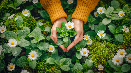 Summer composition with Caring hands cradle wild daisy flowers among lush foliage, forming a heart, a visual hymn to eco-consciousness and nature's delicate beauty, inspiring preservation