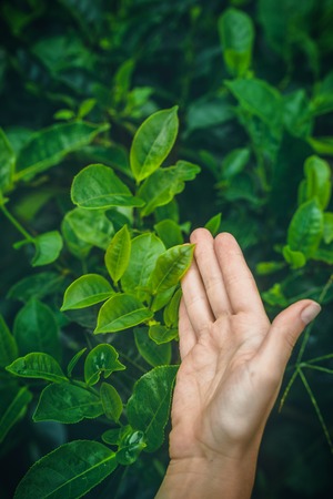 A woman's hand strokes a bush of green tea