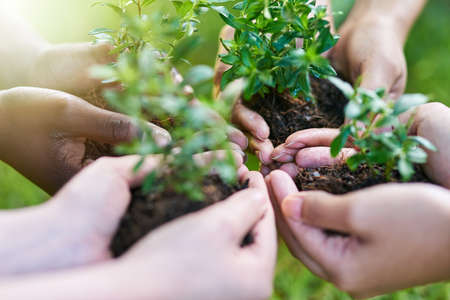 Volunteer, people or hands with plant for nature restoration project, eco advocate or green initiative. Responsibility, sustainable environment or team with support for climate action, outdoor or ngo