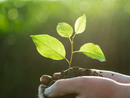 ecological concept nature background Detail of a young man's hand holding a green sapling growing from the soil environment, forest conservation concept.