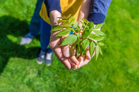 Child and father holding a tree in their hands. selective focus. Nature.