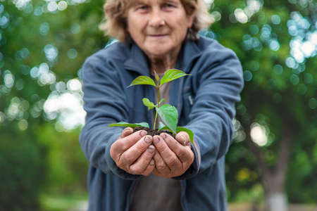 Grandmother is planting a tree in the garden. selective focus. people.