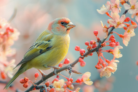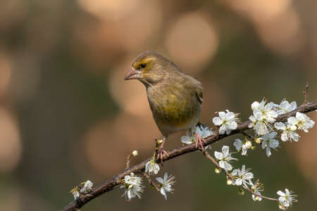 Greenfinch female on blooming branch