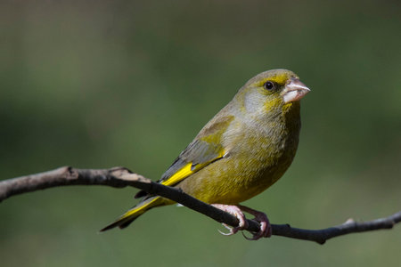 Male Greenfinch (Cardualis chloris) perched on a branch in an ecological nature park