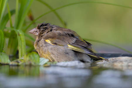 Male Greenfinch (Cardualis chloris) drinking water from a pool in an ecological nature park