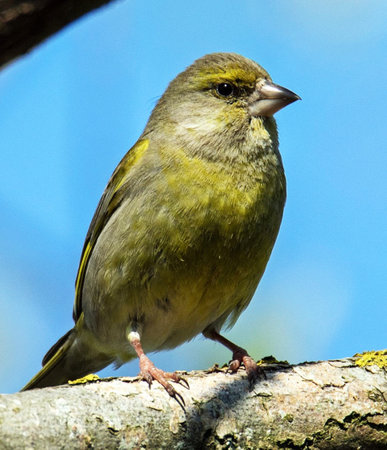Greenfinch sits on a tree branch against a clear blue sky