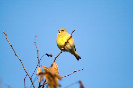 Greenfinch perched on a branch against a clear blue sky background