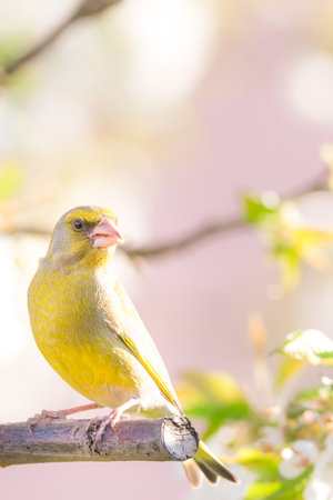 Vertical photo of single nice greenfinch. Bird is perched on branch of cherry tree with many spring blooms. Bird has colorful feathers with bright yellow color on wings and body.