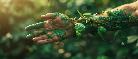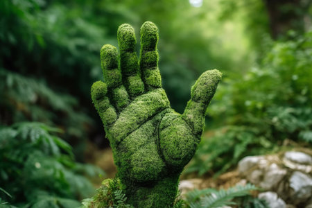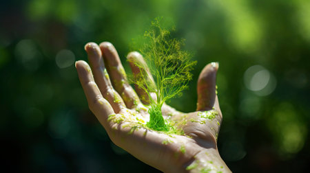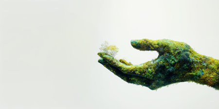 A hyper-realistic depiction of a hand covered in vibrant green moss, gently holding a small tree. The contrast of the lush hand against the white background creates a dreamlike quality.