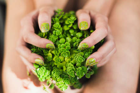 This eco-friendly concept depicts a hand with a green branch. The plant on the arm represents the oneness between nature and mankind. Protect and love nature. Think green. Ecology concept.