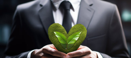 A businessman grasping a leaf with a green heart symbolizes the company's commitment to corporate so