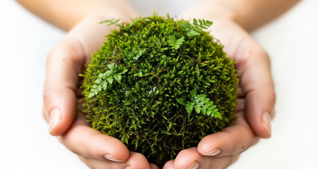 The image showcases hands cradling a globe formed of lush green vegetation. The composition features soft lighting and a focus on texture. It evokes themes of environmentalism and sustainability, suggesting a connection to nature and global responsibility. Suitable for various editorial and commercial applications.