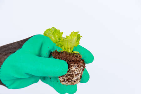 Lettuce seedlings holding a gloved farmers hand on a white background.