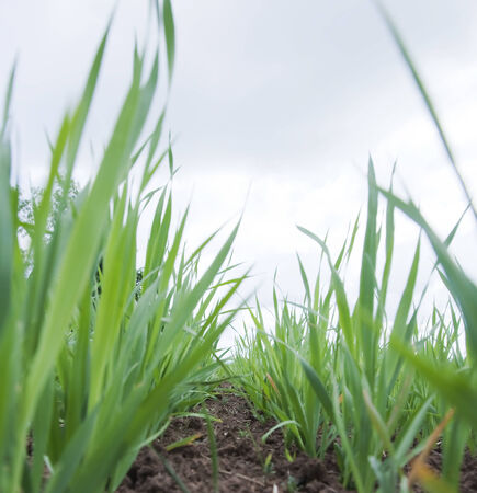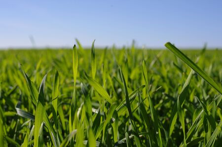 Young wheat seedlings growing on a field in autumn. Young green wheat growing in soil. Agricultural proces. Close up on sprouting rye agriculture on a field sunny day with blue sky. Sprouts of rye.