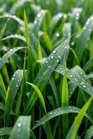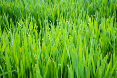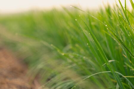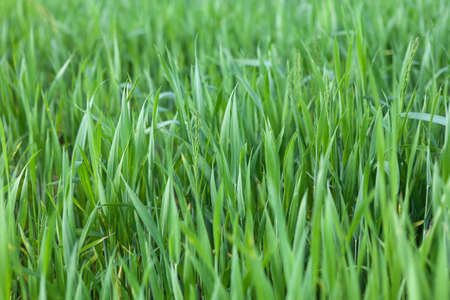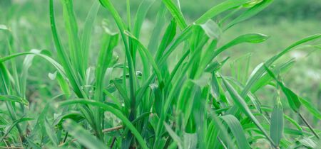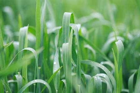 Lush green grass. Spring background. Drops of dew on the leaves. Copy space.