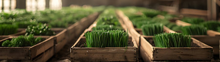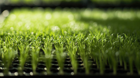 A close-up view of vibrant grass sprouts thriving in a greenhouse, illuminated by natural sunlight. This image captures the essence of plant growth and nurturing in an agricultural setting.