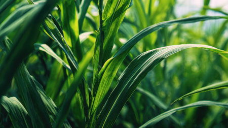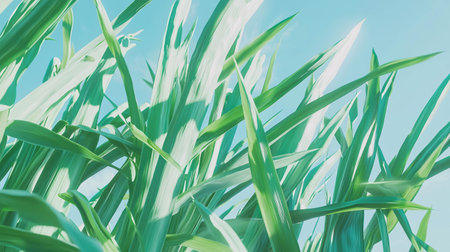 Fresh green linear leaf of Sugarcane in agriculture planting field under vivid blue sky