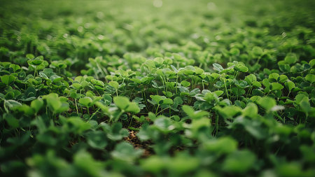 A close-up view of a patch of young, vibrant green plants, bathed in the warm glow of the sun. The plants are densely packed together, with their leaves reaching towards the light, showcasing the beauty of nature's early growth.