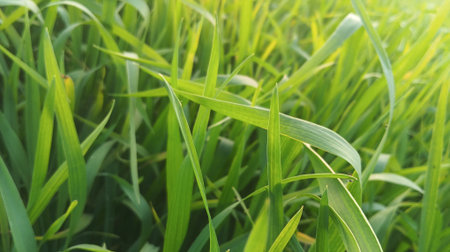 Close-up view of vibrant green grass blades bathed in sunlight. A serene and peaceful image of nature's beauty