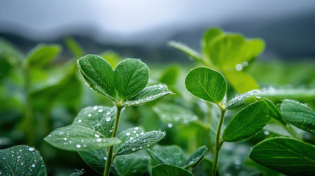 This serene image showcases vibrant green plants adorned with dew drops in a soft foggy setting, reflecting nature's tranquil beauty.