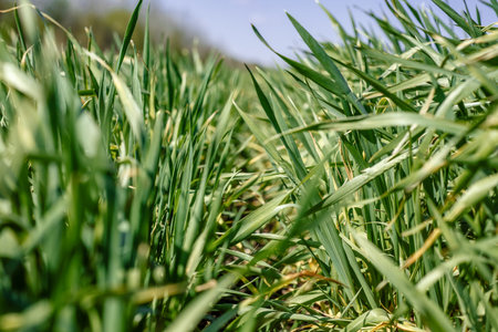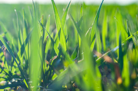 Low angle closeup in a young green rye field in the morning warm sunlight. Shallow depth of field.