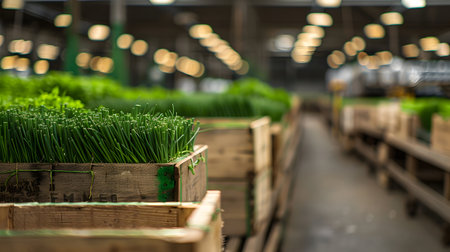 Chives harvested in wooden boxes in a warehouse. Natural organic fruit abundance. Healthy and natural food storing and shipping concept.