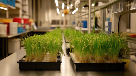 A modern laboratory scene featuring rows of vibrant green rice seedlings nurtured in trays, emphasizing agricultural research practices under controlled lighting conditions.