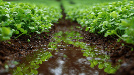 This captivating image showcases vibrant green plant leaves adorned with water droplets, highlighting nature's beauty and freshness. Perfect for various themes.