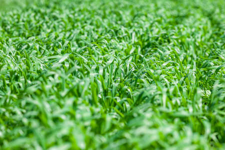 Endless green farm fields with growing wheat and corn in spring. High quality photo