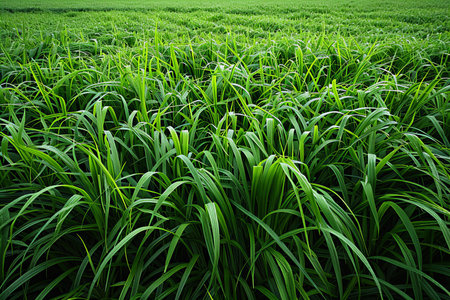 Bright green grass blades dance in the wind under warm sunlight in a serene rural field. The lush scenery creates a peaceful atmosphere, inviting nature lovers to relax.