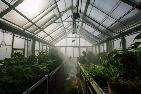 greenhouse with plant life and carbon dioxide emissions, created with generative ai