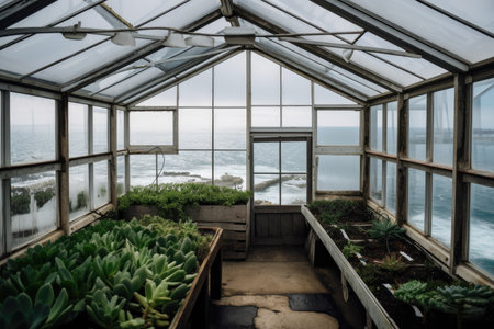 greenhouse with view of ocean waves crashing against the shore, created with generative ai