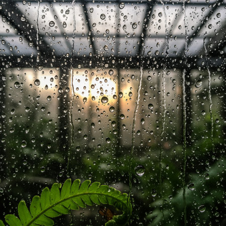 Rain drops on the glass window in the greenhouse. Rainy day.