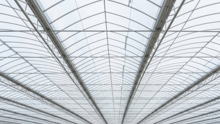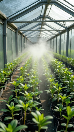 Explore the serene atmosphere of a modern greenhouse filled with lush plants. The soft lighting enhances the tranquil environment, showcasing supportive growth and sustainability in agriculture.