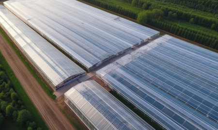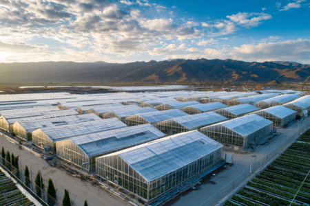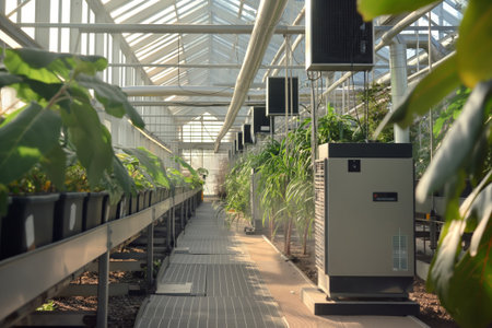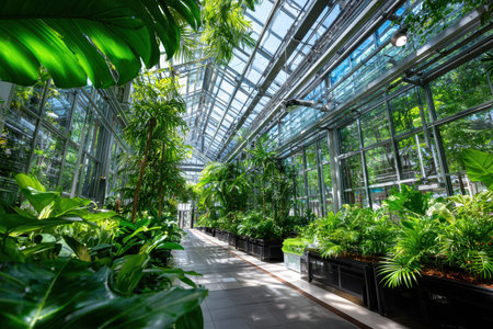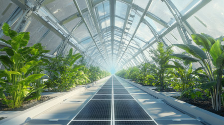 A modern greenhouse featuring advanced solar panels and abundant greenery. This setting highlights sustainable agriculture and innovative technology for eco-friendly growth.