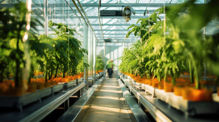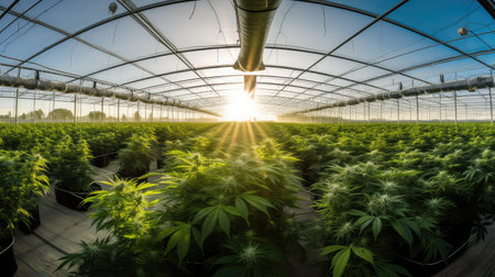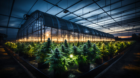 Spacious modern greenhouse with rows of emerging hemp seedlings. High-tech facility with advanced hydroponic systems. Legalized cannabis cultivation for medical purpose.
