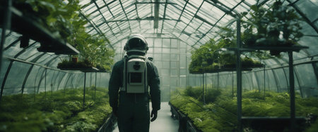 Young man in protective suit walking through a greenhouse with green plants.