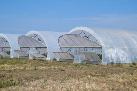 Large greenhouse in the countryside with blue sky background. Modern greenhouse for growing vegetables and flowers. Farming and agriculture concept.