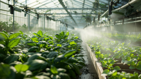 Lush green plants thrive in a misty greenhouse, showcasing a nurturing environment ideal for growth. The atmosphere promotes freshness and vitality.