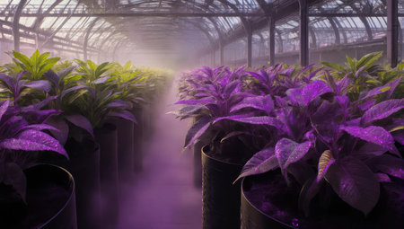 Rows of vibrant plants in a greenhouse, bathed in a soft purple glow with misty atmosphere