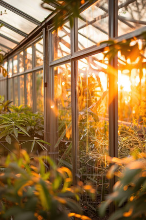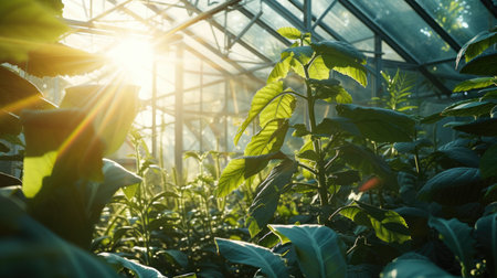 A captivating scene featuring soft sunlight streaming through a greenhouse, illuminating lush green plants, creating an atmosphere of tranquility and serenity.