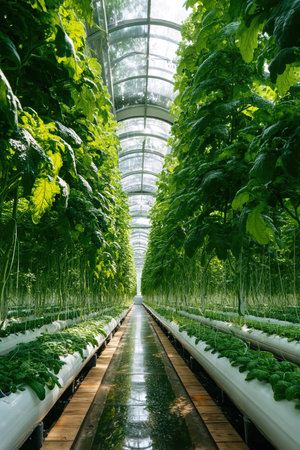 Sunlit aisle inside a high-tech greenhouse featuring advanced hydroponic plant production