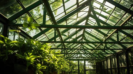 Discover a haven of greenery and sunlight inside a transparent-roofed greenhouse. designe