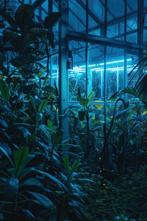 Futuristic Greenhouse: Nighttime Ambiance with LED Illuminated Plants in Tranquil Setting