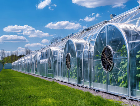Modern greenhouses under blue sky with fluffy clouds, showcasing innovative agricultural technology and vibrant green plants growing inside. Sustainable farming concept.