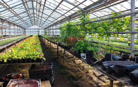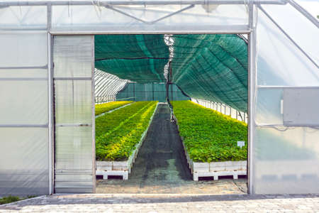 A large, modern greenhouse filled with rows of plants. Plenty of copy space available