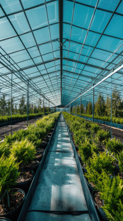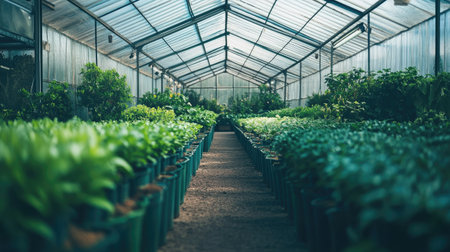 Explore the serene atmosphere of a modern greenhouse filled with lush plants. The soft lighting enhances the tranquil environment, showcasing supportive growth and sustainability in agriculture.