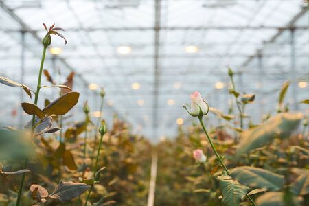 Rows of plants growing inside big industrial greenhouse. Industrial agriculture background.
