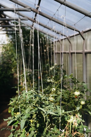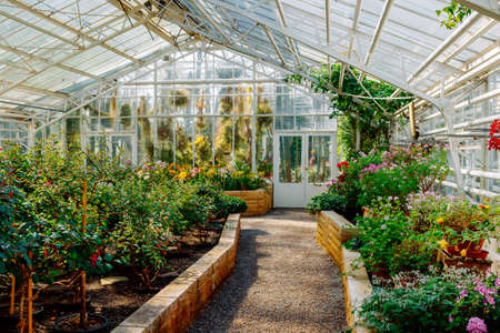 Beautiful view of a greenhouse in the sun. Sunlight through the glass.