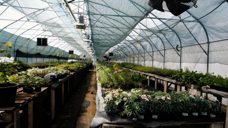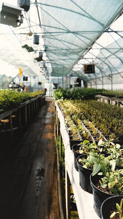 Serene greenhouse filled with lush greenery and potted plants during daylight